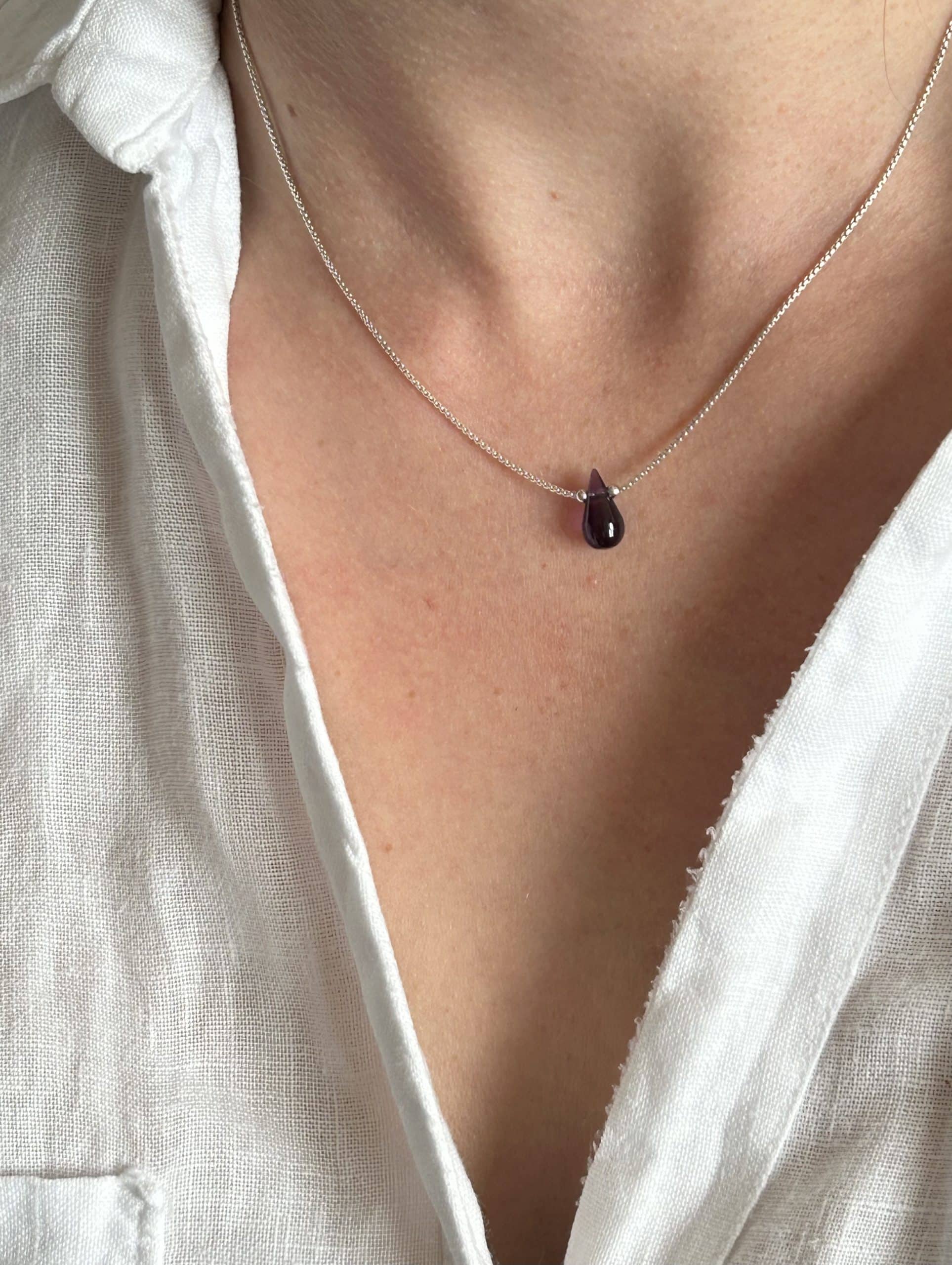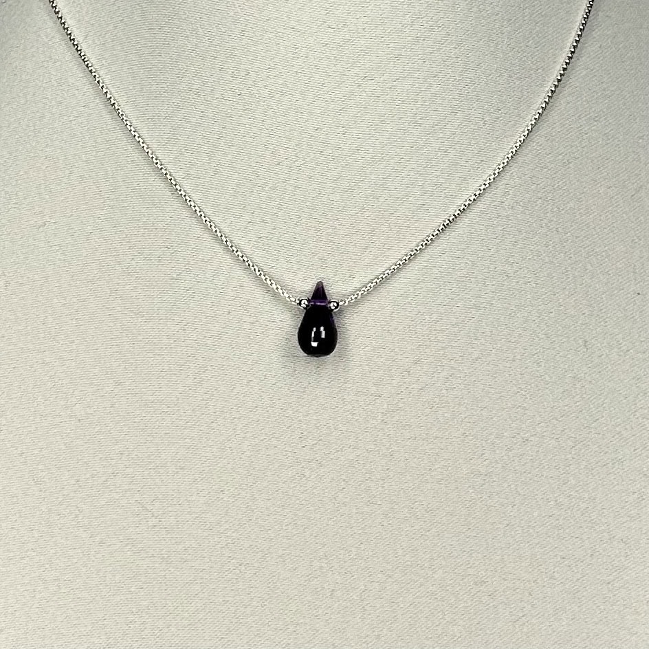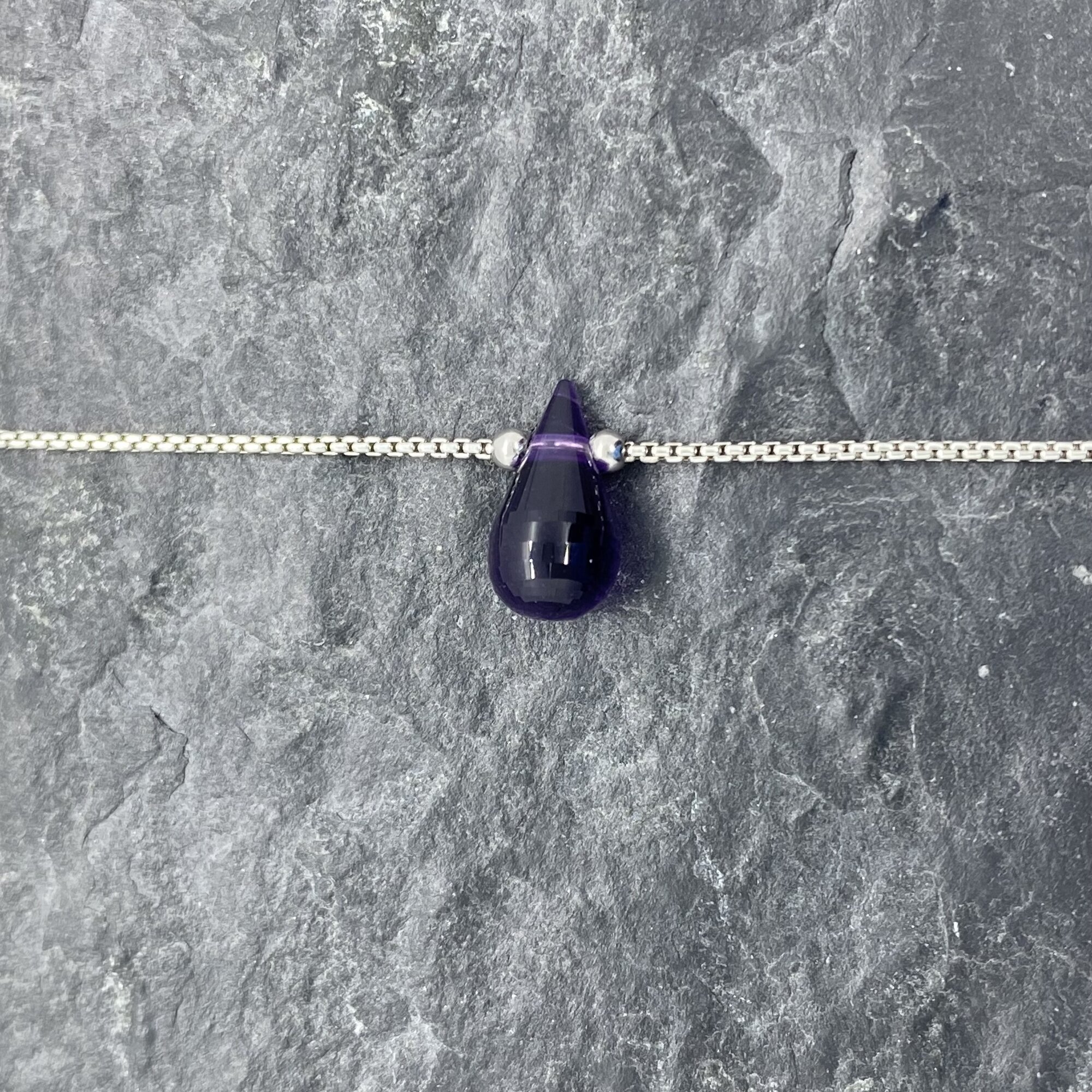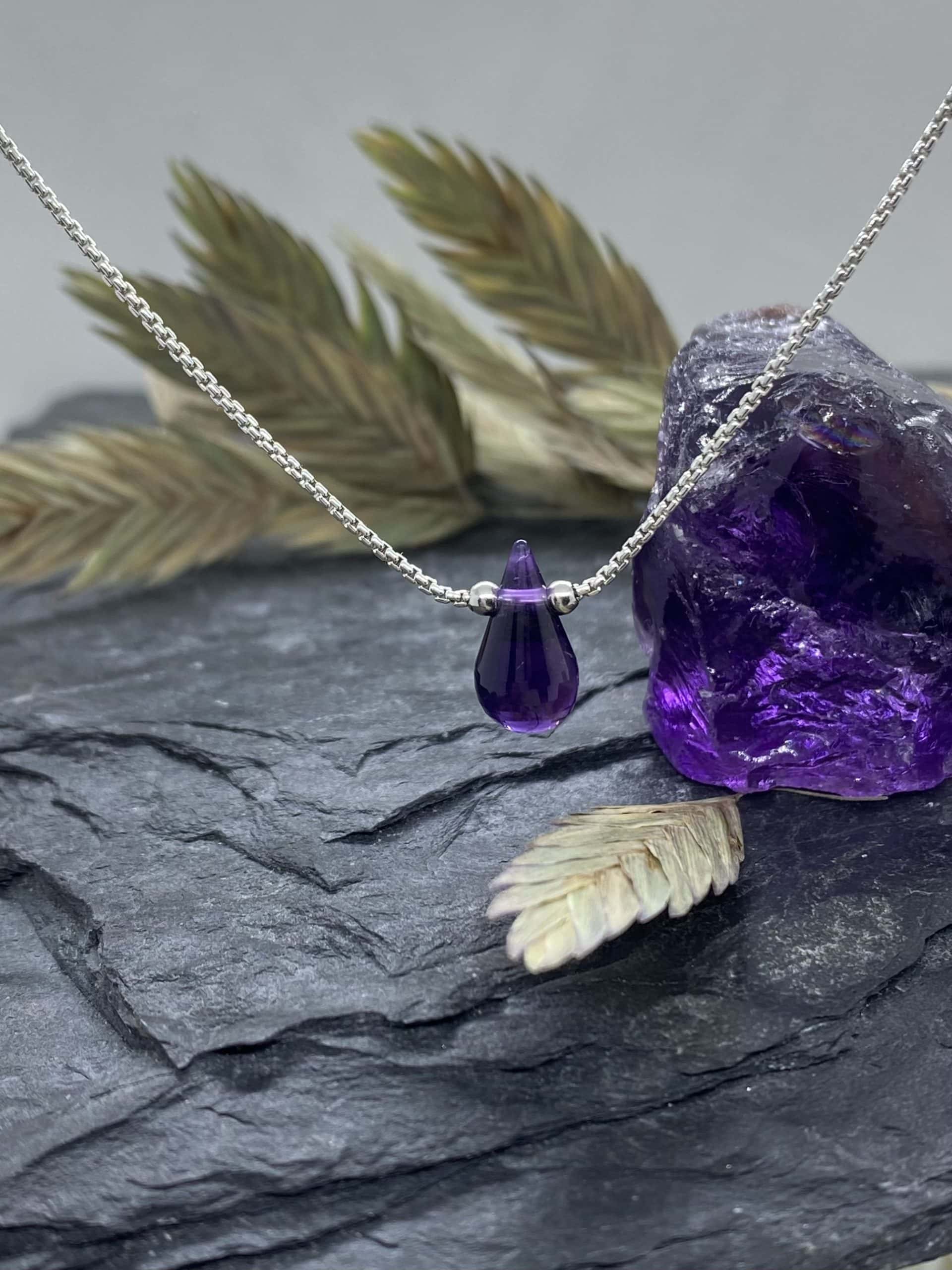 Ce collier met en valeur une Améthyste naturelle, taillée artisanalement en forme de larme, symbole de renaissance et de lumière.